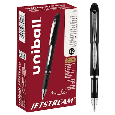 Work on essays, compositions, and other writing projects with this 12-pack of uni JETSTREAM medium-point black ballpoint pens.