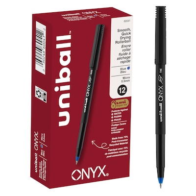 Stock your office, home or classroom with Onyx Rollerball Stick Pens from uniball featuring a strong, long lasting 0.5mm micro tip. This rollerball pen delivers the silky-smooth glide of a fountain pen without smudging for effortless writing. Micro point pens produce neat and precise lines for intricate writing, making it easy to create super fine details in your drawings and diagrams. Capped roller pens are useful for a variety of tasks from note taking to signing checks and legal documents to uniquely embellishing fun and creative writing projects. Innovative uni Super Ink technology forms a strong bond with the paper, protecting from water, fading and fraud. A great economic and environmental choice as this super sleek micro point roller pen is made from 73% post-consumer recycled material.