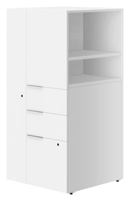 - Combines lateral filing, supply, wardrobe storage and convenient open shelves in a compact footprint