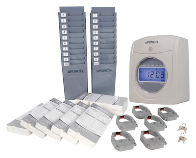 uPunch HN4000 Electronic Calculating Punch Card Time Clock, 350 time cards, two 10-slot time card racks, four keys, and six 2-color ribbons.