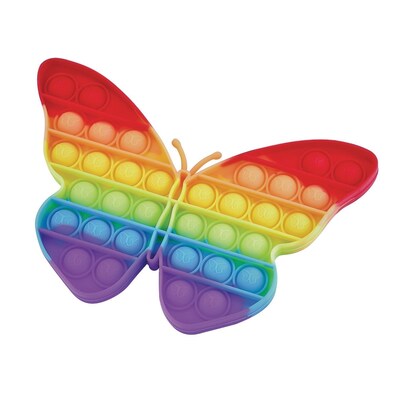 Fun to pick up, hard to put down, this finger fidget satisfies the tactile senses of the young, old and everyone in between! This butterfly shaped fidget toy has 34 bubbles just waiting to be pushed and popped over and over again. Made from safe, soft, latex-free silicone rubber in a rainbow of inviting colors. Approximately 6" x 6" x 0.5".
