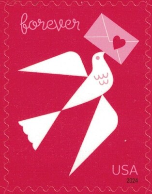Five (5) new sheets of 20 stamps, for a total of one hundred (100) stamps. Each of these United States Postal Service Forever Stamps features a white bird carrying in its beak a pink envelope sealed with a red heart. The stamps have a solid red background. Stamps are self-stick (peel and stick) for easy mailing. USPS Forever Stamps are always valid for one-ounce First Class Mail, even when the rates go up, so stock up now before the next rate increase. These stamps can also be used towards the total cost of ANY USPS letters or packages. Each stamp has a face value equal to the current Forever Stamp rate, so you can use multiple stamps or additional postage to cover your total shipping cost.