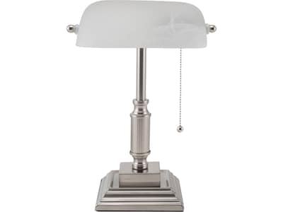 Improve your workstation with the classic V-Light LED banker's desk lamp. The vintage design, white marble frosted shade, and brushed nickel finish provide a traditional professional appearance and enhance the look of your desk. The energy-saving LED bulb improves visibility with bright, warm light. Features old-fashioned pull chain and a multistep pedestal base.