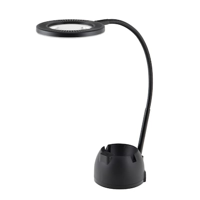 Enhance your workspace with the V-LIGHT Magnifying LED Desk Lamp, designed for precision tasks and added convenience. Features a built-in magnifying lens with 2x magnification perfect for detailed work, reading small text, or hobbies requiring precision. The adjustable gooseneck design allows you to position the light and magnifier exactly where you need them. The base conveniently includes a smart device slot stand. Equipped with a 3-watt LED bulb with a touch dimmer switch, providing bright, focused light while using minimal energy. Includes a convenient USB charging port, allowing you to charge your devices while you work. Combines functionality with modern aesthetics, making it a perfect fit for any desk or workspace. Ideal for tasks that require enhanced visibility and extra lighting, with the added benefit of charging your devices. ETL Listed.