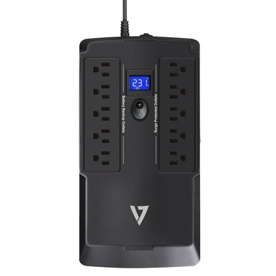 The V7® UPS1DT750-1N 750 VA desktop UPS in black, provides up to 450 W of power to desktop computers, workstations, networking devices and home entertainment systems. It features a 632 J energy rating and an LED indicator for surge protection. It has 10 power outlets and USB port for connection.