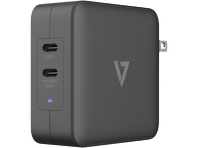 Experience next-level charging with advanced GaN technology. The V7 65W USB-C PD GaN AC charger offers fast charging for multiple devices in a compact, convenient size. Charge a MacBook Pro 15" from 0–50% in under 60 minutes. Featuring high-performance Gallium nitride, or GaN, components, it's more efficient, smaller and produces less heat than typical chargers. The charger features built-in Intelligent power sharing, providing efficient charging one of up to two devices by sensing when each port is in use and directing power.