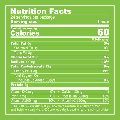 - Ingredients: vegetable juice (water and concentrated juices of tomatoes, carrots, celery, beets, parsley, lettuce, watercress, spinach), salt, vitamin C (ascorbic acid), beta carotene, natural flavoring, citric acid