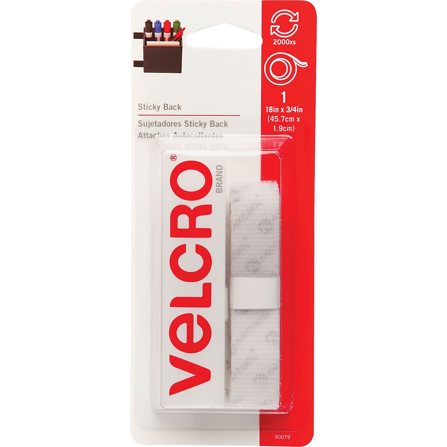 White VELCRO® tape with 3/4" width and 18" length strips adheres to almost any smooth surface.
