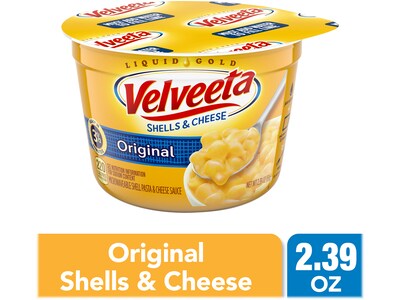 Velveeta Original Shells and Cheese microwaveable cup is an easy dinner that's ready in just minutes. Kids and adults love the rich taste and creamy texture of pasta shells with cheesy goodness. This easy Shells & Cheese meal includes shell pasta and original cheese sauce so you have everything you need to make a quick dinner. This microwave macaroni and cheese is always a great choice for dorm food or a tasty single serve dinner at home.