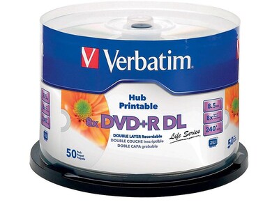 Get twice the storage capacity with this 50-pack of Verbatim DVD+R 8.5GB 8x inkjet printable discs.