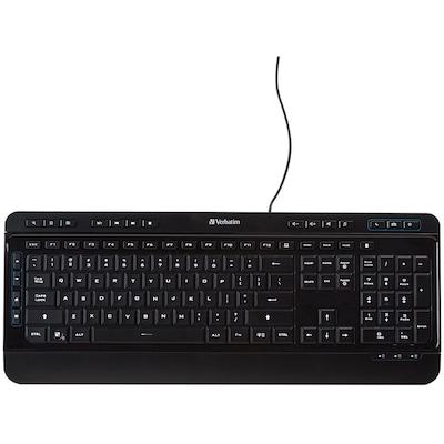 Reduce eyestrain and increase productivity with the Verbatim 99789 Illuminated Wired Keyboard. The keys can be quickly illuminated for easy visibility in low lighting, ideal for working in dim or dark conditions. It features quiet, soft-touch keys that provide a crisp, responsive feel when typing. For full functionality, this keyboard features hot keys for instant access to media controls as well as a full numeric keypad and full-size function keys. With its slim design and simple plug and play USB connection, this keyboard is ideal for the home or office. The Verbatim Illuminated Keyboard is backed by a 1-year limited warranty.