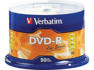 Store up to two hours of video or 4.7GB of data on each of these writable discs. Accommodating a 16x recording speed, these DVD-R discs can be fully written in about five minutes, so large system backups or file transfers can be completed quickly. This pack contains 50 Verbatim Life Series DVD-R discs compatible with any DVD drive or player, making it easy to view and share stored files.
