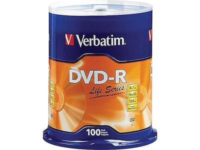 Transfer files and videos to secure storage with these Verbatim DVD-R Life Series discs 100-pack.