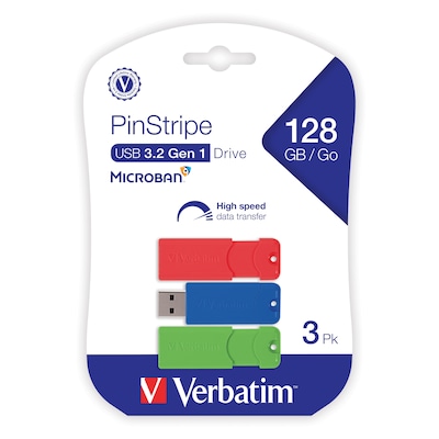 Verbatim PinStripe 128GB USB 3.2 Type-A Flash Drive, Red/Green/Blue, 3/Pack (70390)
