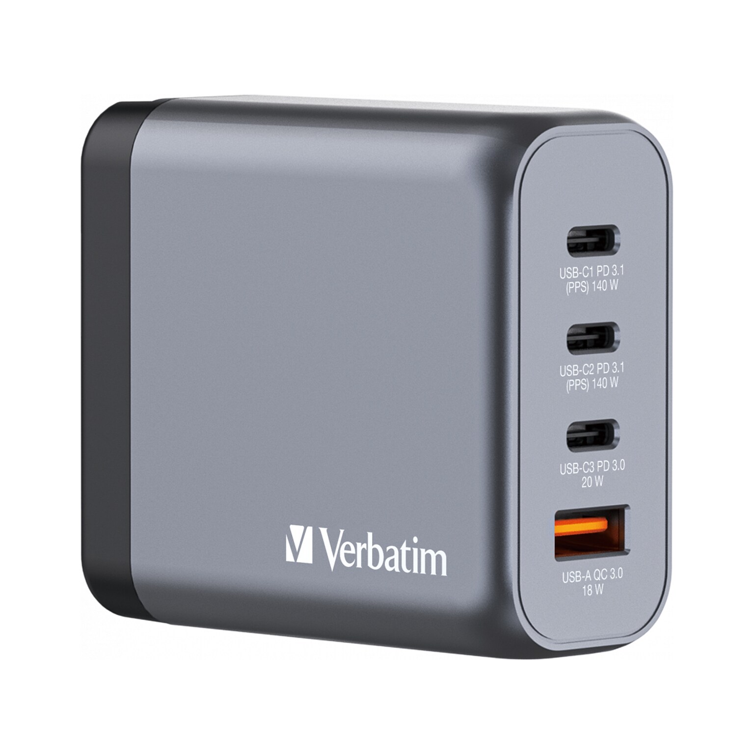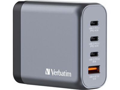 Verbatim's 140W GaN wall charger combines two USB Type-C PD 140W ports, one USB Type-C PD 20W port, and one USB Type-A QC 3.0 port in a sleek, palm-size design. Perfect for the office, home, or travelling to power your laptop, tablet, smartphone, gaming devices, and more. With its foldable US prongs and replaceable EU and UK plugs, it's an ultimate travel companion.