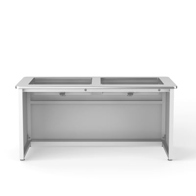 The innovative design of the Downview Computer Desk protects computer equipment, maximizes writing space, provides an unobstructed view, and remains ergonomic and comfortable. Did you ever think you could expect so much from a desk" Constructed of high-quality steel, the Downview Computer Desk supports a laminated wood surface inlaid with an anti-glare, tempered glass panel. Flat screen computer monitors of up to 24" can be mounted below the glass surface, allowing users to see them clearly and easily, but also maximizing space on the desktop. An Enclosed CPU Holder, modesty panel, and cable management system hides cables and wires out of view and prevents trip hazards. This fixed-height table is adjustable from 29" to 31" upon assembly and comes in both single user and dual user sizes, all available in eight attractive color combinations.