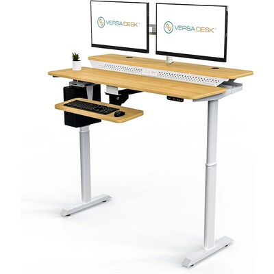 The VersaDesk 48" Wide Powerlift Split-Level Electric Standing Desk is an ideal choice for creating a versatile and ergonomic workspace, whether in professional or home office settings. This desk features a white frame with a sleek maple surface and is available in various sizes (48"x30", 60"x30", 72"x30") and finishes (Black, Maple, White). Designed to fit into diverse environments like offices, dormitories, bedrooms, living rooms, and classrooms, it measures 48" wide by 30" deep. Constructed with a sturdy alloy steel base and an engineered wood top with a laminated and powder-coated finish, this desk is built for durability and style. It's tailored for computer use and includes notable features such as adjustable height, built-in USB outlets, and electric operation. With the push of a button, the desk smoothly adjusts from sitting to standing positions. It includes three USB outlets and two power outlets, ensuring ample connectivity for your devices. The dual motor, 2-stage legs offer a quiet up/down motion, allowing for height adjustments from 31" to 44".