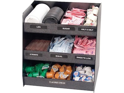 Create a space for guests to grab their own coffee flavorings or food toppings with this Vertiflex vertical condiment organizer. The narrow design fits between coffee makers or buffet platters, and removable dividers let you customize the setup to accommodate large or small items. Crafted from durable plastic, this Vertiflex vertical condiment organizer stands up to daily use in your break room, reception area or cafeteria.