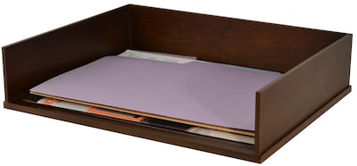 Wood desk accessory holds papers and folders, stackable up to five high for desk organization.