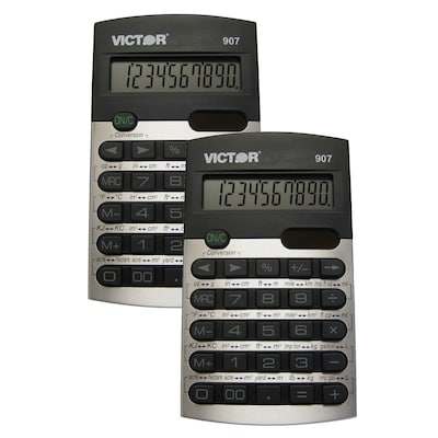 The Victor 907, 10 digit calculator features 20 built-in metric conversion functions including: length, area, capacity, weight, volume, energy and temperature conversions. The calculator includes an easy to read LCD display. Other functions include: backspace, change sign, percent, and square root keys as well as three key independent memory. Contemporary silver and black design. Operates on hybrid power (solar and battery backup). 2 year manufacturer's standard warranty. Sold as a pack of 2 calculators.