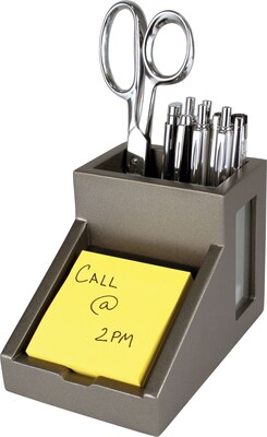 - The Victor Silver Pencil Cup with Note Holder holds writing utensils with an angled note holder