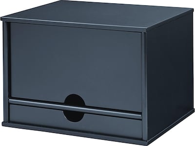 Eliminate loose paperwork and other clutter with this desktop organizer. Featuring four full-sized shelves, this organizer offers plenty of room for file categorization, while the large supply drawer is ideal for containing sticky notes, scissors, and other various accessories. This Victor Midnight Black desktop organizer is made from wood for enhanced durability and has a sliding door, so you can cover up contents for a clean, tidy appearance.