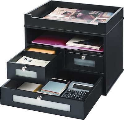 • Make the most out of limited space with the tower organizer. Includes a letter tray, shelf and three drawers combined into a footprint only slightly larger than a notebook