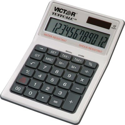 Victor® Tuffcalc™ Desktop calculator featuring a 12-digit large angled display to provide distinct visibility lets you perform different calculations quickly. Calculator that can be operated from solar power or battery is water and shock resistant.
