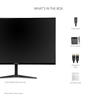 With an immersive 1500R curved screen and stunning WQHD 2560 x 1440 resolution, the ViewSonic VX2718-2KPC-MHD monitor provides an incredible viewing experience for work or play. With features including a high 165Hz* refresh rate, 1ms (MPRT) response time and adaptive sync technology, this monitor virtually eliminates screen tearing and stuttering for a fluid gaming experience. The VX2718-2KPC-MHD also comes equipped with ViewSonic exclusive ViewMode presets, which offer optimized screen performance for different home entertainment applications such as watching movies, editing files, or playing video games. Two HDMI (v2.0) inputs, and one DisplayPort (v1.2) input offers flexible connectivity for both general use and entertainment.