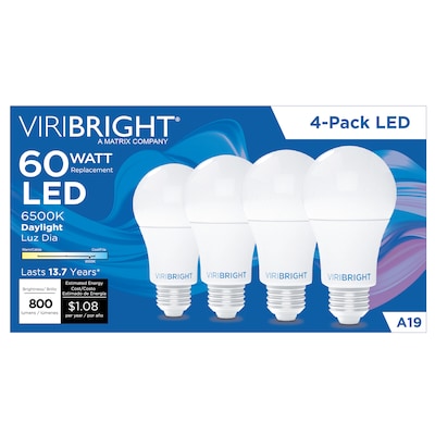 This 4-pack of non-dimmable bulbs emits a cozy 2700K warm white glow at 800 lumens, using only 9 watts to provide the equivalent illumination of a traditional 60-watt incandescent bulb. Designed for convenience and reliability, the VIRIBRIGHT A19 LED bulb features a standard E26 base, making it compatible with most table lamps, ceiling fixtures, and wall sconces. It delivers steady, flicker-free lighting ideal for everyday use, instantly illuminating any space without delay. With a lifespan of up to 10,000 hours, these bulbs drastically reduce maintenance and replacement needs, providing dependable lighting that saves money and supports eco-friendly living.