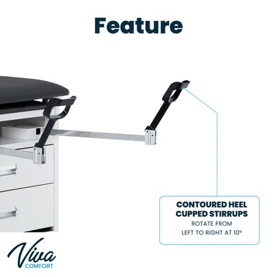 When outfitting your examination rooms, it's crucial to remember how much space your furniture will take up. You want to provide enough room for you and your patient but also have storage capabilities, room for cabinets, a sink, and, most importantly, a medical table. Our Viva Premium Comfort Grande Steel Exam Table is the ideal, most affordable solution without skimping on features or quality. We wanted to deliver a product you could feel confident will last; that is why our exam tables are made from robust steel to be corrosion resistant, withstand continual physical stress, and be simple to maintain, fortifying its longevity. The base of our table has a dual-sided, connecting cabinet, allowing you to position the table however you like without compromising on cabinet entry. For your frequently used medical items, the two euro-style drawers with stainless steel slides in the front of the base will offer you sufficient storage and access. As an added benefit, the drawers and doors of the table have been formulated to be soft closing for that added touch of comfort. A pull-out step stool is also in front of the table with a safety tread so patients can safely get on and off the exam table. You can easily pull out or tuck the step stool utilizing just your foot, which intern reduces strain from bending down. We've outfitted each exam table with powder-coated adjustable stir-ups with contoured heel cups, allowing for comfortable foot placement. They can be tucked away when not in use, creating more space for you and your patient.