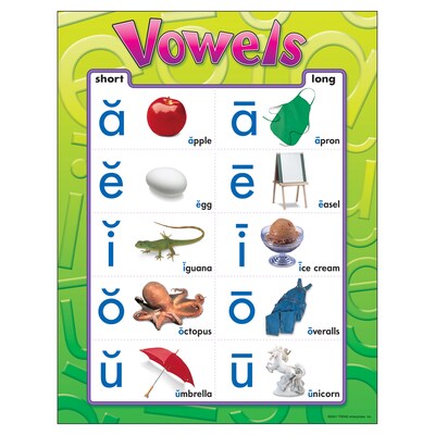 Trend Enterprises® "Vowels" Learning chart for grades 1 - 2 features photographic cues that help to learn pronunciation accurately. Chart is provided with reproducible activities, subject information and helpful tips on the back for easy learning.