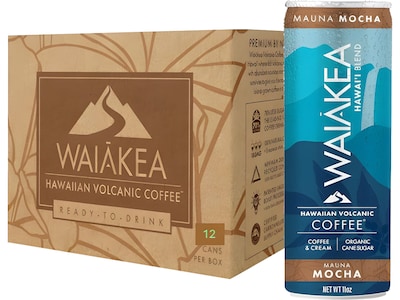 Enjoy Waiakea's Hawaiian Volcanic 11 oz. Mauna Mocha coffee, sold in a 12-pack. This cold brew made with organic cane sugar is the perfect pick-me-up. The Waiakea Hawaiian Volcanic coffee is grown in Hawaii. The rich volcanic soil combines with abundant mountain rain and tropical sunshine, giving Hawaii its incredibly delicious island-grown coffee. A delightful combination of chocolate and coffee, ready to take on the go.