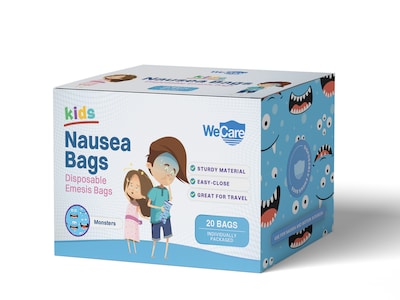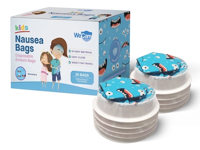 At home or on the go, the WeCare Monsters emesis bag is a great catch for accidents. Made with sturdy materials and a notched lid, the Emesis bag won't spill or break. Reduce contamination and prevent bad smells, all while keeping your space clean and germ-free. Not made with natural rubber latex. Show others that you care, with WeCare.