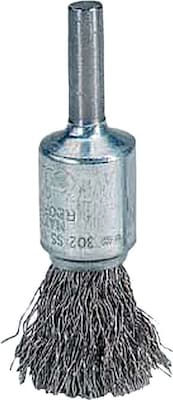 Weiler® Crimped solid end brush features 1/4" stem, 0.006" x 7/8" carbon steel bristle and operates at a speed of 25000 RPM. Brush is used for cleaning and finishing in recessed areas.
