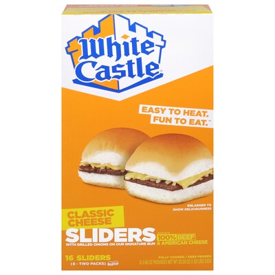 White Castle Classic Cheese Sliders (frozen) check all the boxes. Fan favorite, one-of-a-kind steam-grilled taste, ready whenever you Crave. Every 29.28 Oz. carton of Sliders contains 16 sandwiches (8 individually wrapped 2-packs), already fully cooked to lock in that melty, steamy flavor. Just pop your Sliders from the freezer into the microwave and enjoy! With 2 Sliders per serving, White Castle is great for kids as an after-school snack, to share with friends after the after party, or an indulgent any-time treat you keep all for yourself. Each sandwich is made with 100% USDA inspected beef, melty American cheese and topped with our soft, signature White Castle bakery bun. Delicious as is or elevate microwavable Sliders for an easy meal by adding your favorite toppings and condiments or frozen sides. Keep all our White Castle Slider varieties on hand so you can make a quick trip to the freezer instead of a trip to the drive-thru. Because if you have a microwave, you have a White Castle. Serving up WHAT YOU CRAVE since 1921.