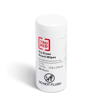 Maintain dry-erase boards in between meetings or lectures with these dry-erase board wipes. The premoistened wipes are non-toxic and odorless for safe use and easily remove dry-erase marker from a range of surfaces. A dispenser cap makes it simple to remove each wipe as needed. With 50 disposable cloths in the container, these TRU RED™ dry-erase board wipes handle daily maintenance.
