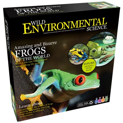 Amazing and Bizarre Frogs of the World is ideal for creative and scientific young minds! Children can build and customize their own life-size Tree Frog and display a frog life cycle. Children can also assemble a detailed 3D model of a frog. Build and decorate a themed diorama and hang up the included poster! Children will learn about learn about the science of studying frogs and their amazing adaptations to different environments. This science kit includes safe, high-quality ingredients and a full-color education and instruction booklet which includes detailed, step-by-step illustrations. Perfect for science fairs and class projects! Includes: Frog-themed molds, diorama, 3D frog wooden puzzle, poster, beaker, Plaster of Paris, acrylic paints, paintbrush, instruction booklet and safety leaflet.