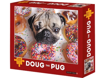 Doug the Pug, aka the King of Pop Culture, loves the camera, and this puzzle of Doug with his favorite pastries proves the camera loves him as well. Proudly made in the USA, the Willow Creek Doug the Pug 1000 precision-cut fully interlocking pieces are poly-bagged to insure their protection inside the shelf-friendly box.
