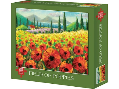 Challenge your puzzle-solving skills with the Willow Creek Field of Poppies 1000-piece puzzle. This vivid scene is composed of 1000 fully interlocking pieces, perfect for hours of entertainment. With the precision-cut pieces, you can easily assemble and revel in the satisfaction of completing the puzzle. Made in the USA, this delightful 1000-piece puzzle is poly-bagged to ensure its protection inside the shelf-friendly box. Includes a full-color poster (the same size as the puzzle).