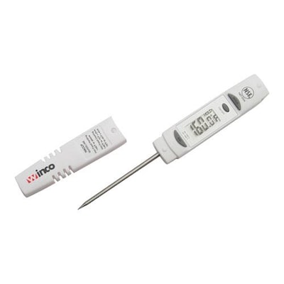 The Winco TMT-DG4 pocket thermometer is designed to be easily transported around your kitchen and help provide accurate measurements that ensure food safety. This model has an easy-to-read digital display and can measure temperatures ranging from -40 to 450 degrees Fahrenheit. It comes equipped with a 31?8-inch-long probe and protective sheath to help keep the probe sanitary when it is not in use.