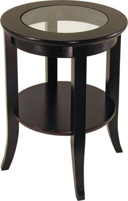 Winsome Genoa end table features a large shelf at bottom for storage and display.Table has easy clean glass top with frame and shelf featuring dark espresso finish.