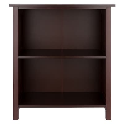 Winsome Milan 2-tier medium storage shelf or bookcase in an appealing antique walnut finish has solid and composite wood construction for durability. Storage shelf accommodates any interior and requires assembly.