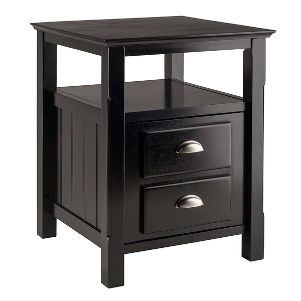 Winsome Timber night stand features solid wood top, open shelf for holding books or magazines and drawers with metal handles for concealed storage. Night stand in black finish has wood construction for durability.
