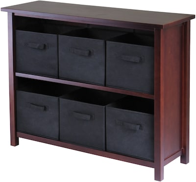Winsome Verona 2 section W storage shelf features 6 foldable black fabric baskets for convenient storage of books or other supplies. Shelf in walnut finish complements any room in your home.