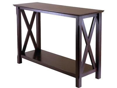 Accent your professional decor with this Winsome Xola console table. A rich cappuccino finish delivers a warm, welcoming look, while the wood detailing and crisscross sides offer sophisticated style. The open bottom shelf accommodates books, office supplies and reams of paper for flexible storage options. Use the spacious tabletop to display decor pieces and office awards. This Winsome Xola console table features a rectangular design, making it perfect for placement behind a sofa or along an office wall.