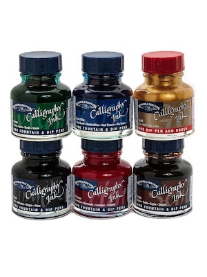 This introductory set of inks includes six 30 ml bottles of color. Green, Sepia, Crimson and Dark Blue are suitable for use in a dip pen, fountain pen, airbrush and technical pen. Black and Gold are for use only with dip pen and brush. All Winsor & Newton Calligraphy Inks have been formulated with carefully chosen pigments to ensure maximum brilliance of color. They are lightfast, non-waterproof, non-clogging, and particularly suited for calligraphy.