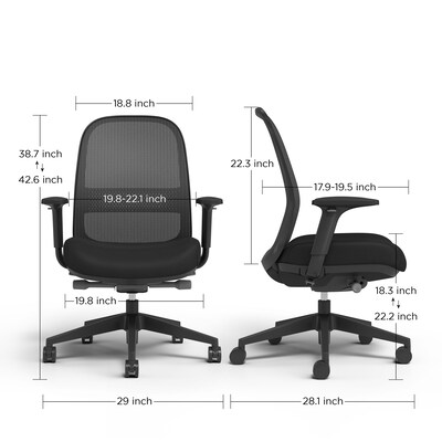 The Workplace2.0™ Bedford offers enduring quality, dependable comfort, and professional style. With intuitive design features like adjustable lumbar and seat, finding your perfect sitting position is effortless. The memory foam seat maintains its shape, while the breathable mesh back keeps you cool all day. Supported by easy gliding casters and a commercial-grade five-star base, it accommodates up to 275 lbs. Available in sleek black with a fabric seat and adjustable armrests, it ensures optimal support and alignment for your forearms and shoulders. Easily adjust reclining resistance with the side tilt tension adjustment. Customize lumbar support for personalized comfort. Experience lasting quality and comfort with the Workplace2.0™ Bedford task chair. Upgrade your workspace with a chair that’s been built to last.