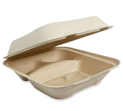 Soak proof, freezer safe, and contain no wax or plastic lining. Great for grocery stores, supermarkets, restaurants, cafes, delis, and food trucks with takeout entrees, burgers, sandwiches and more. 100% compostable in two to four months in a commercial composting facility. Gluten free. The tear drop shaped protuberances on the exterior of the clamshell containers are a trademark of World Centric