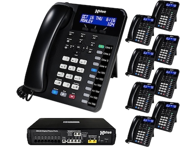 The XBLUE X16 Plus telephone system bundle includes a full suite of business phone system features that rivals that of large corporate PBX systems. The X16 Plus system includes popular business features such as automated attendant, voice mail with individual boxes for every user, call announce intercom and paging, and conference call meeting rooms. In addition, advanced features such as voice mail message delivery to email and fully functional remote office phones are included with the X16 Plus system. The bundle comes with XD10 digital phones featuring 10 programmable buttons for telephone line appearance, viewing the status of other system phones, and speed dialing. The bright, high-visibility LCD display of the XD10 can easily be read at a glance, enabling the user to clearly view caller ID, other call details and the phone's built-in phone book. The XD10 can be mounted on a wall without an additional wall mount kit, and a standard RJ9 connector is included for off-the-shelf headsets.